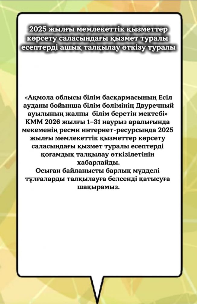 «АҚМОЛА ОБЛЫСЫ БІЛІМ БАСҚАРМАСЫНЫҢ ЕСІЛ АУДАНЫНДАҒЫ ДВУРЕЧНОЕ АУЫЛЫНДАҒЫ ЖАЛПЫ БІЛІМ БЕРУ МЕКТЕП» КМM